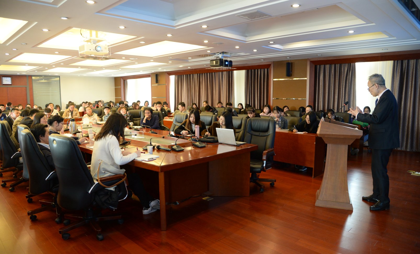 对此次讲座进行了细致的筹划准备工作。讲座由院长蔡颖雯主持,分为主题演讲和互动提问两个环节,学院部分老师和一百多位学生慕名前来聆听讲座,会议室内气氛活跃,座无虚席。此次讲座内容,从法学学术理论到回应司法改革现实,指引了法科生应如何思维,为同学们开阔了学术研究的视野,展现了法学大家的学识和风范。讲座在大家热烈的掌声中圆满结束。